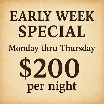 Early week special ~ Monday thru’ Thursday: $200 per night