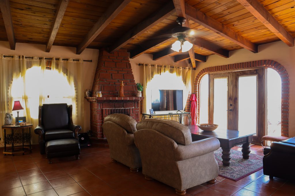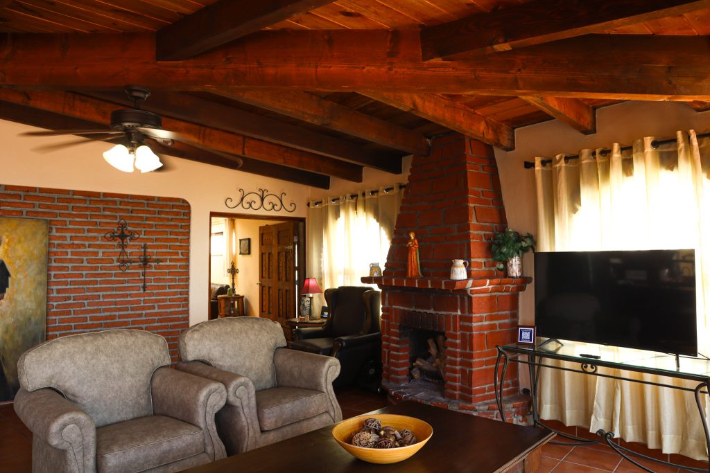 The spacious interior boasts a fully-equipped kitchen, generous dining area, and inviting living room with a charming brick fireplace – perfect for gathering after a day at the beach.